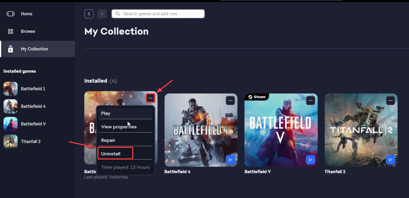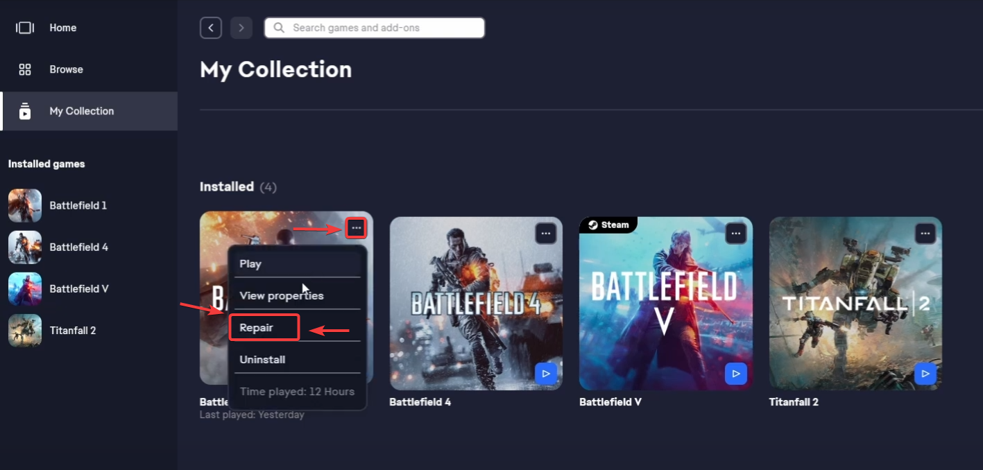 Sometimes the anti-cheat fails not because of itself, but because game files it depends on are missing or damaged. Running a repair validates all installed files against EA’s servers and replaces broken ones.