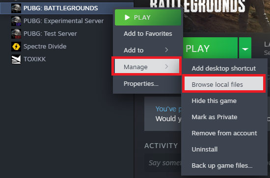 - Right-click the game in your Steam Library > Manage > Browse local files.