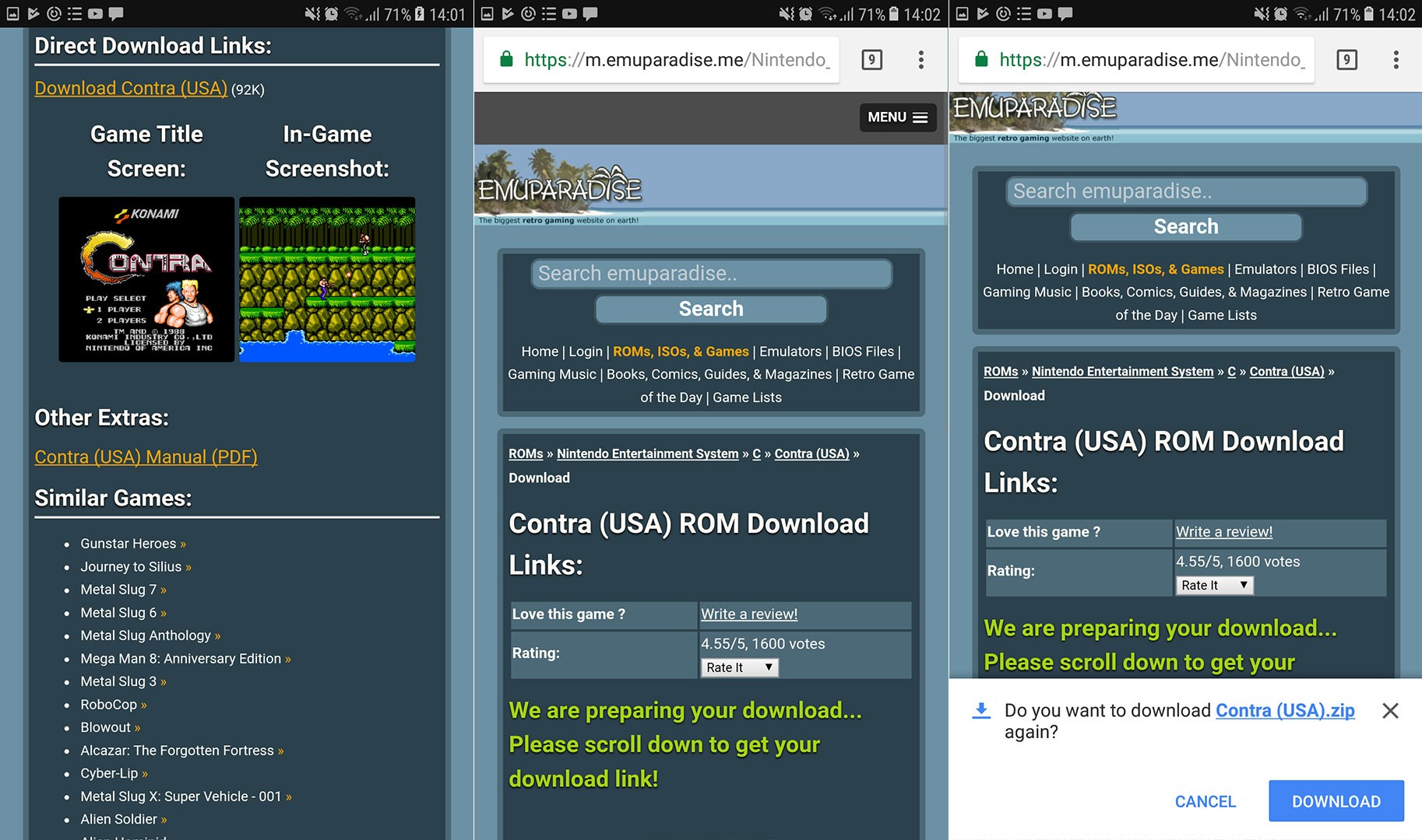When you find your game, click on the name of it and in the following site click on the Download Links. Next, scroll down until you find the text “Direct Download Links” and click on the link under it. In my example, it is “Download Contra (USA)”. After you click the link, wait for a couple of seconds and when the dialog box shows up, click on the Download button. That’s it. You’ve just download your game.