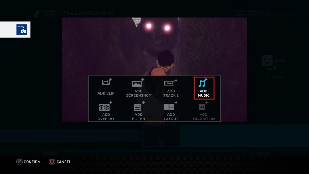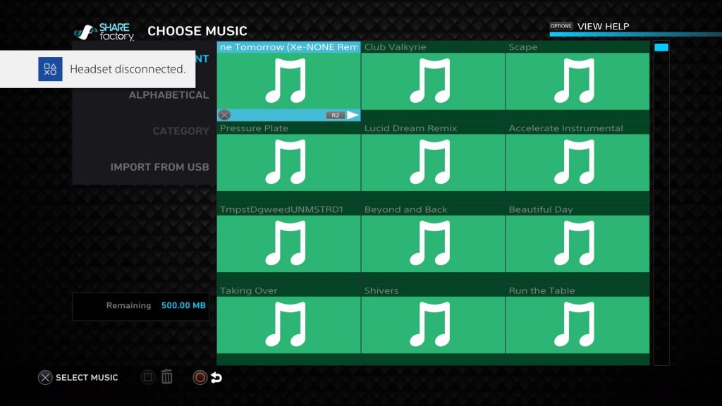 Adding music to your gameplay is pretty straightforward in SHAREfactory. Just like we did before, press the X button to open the Add menu and select Add Music. The default selection of SHAREfactory’s music is quite impressive, but you can add even more by using the Import from USB feature.