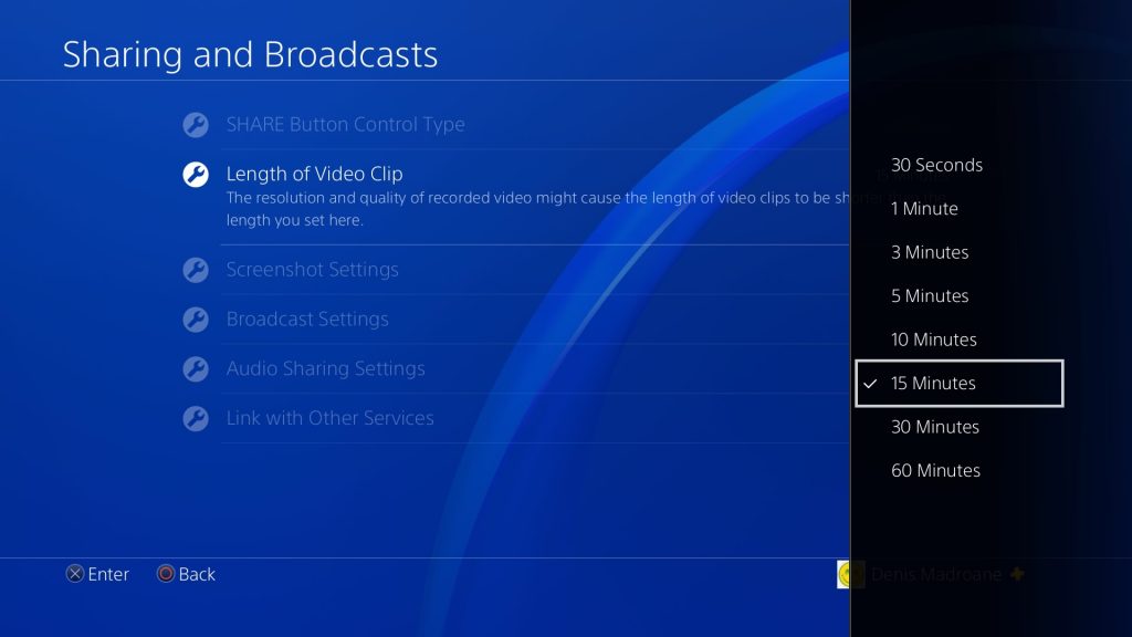 Note: You can expand the default recording length by hitting the Share button and selecting Sharing and Broadcasts Settings. From there, select Length of Video Clip and select another option from the drop-down menu.