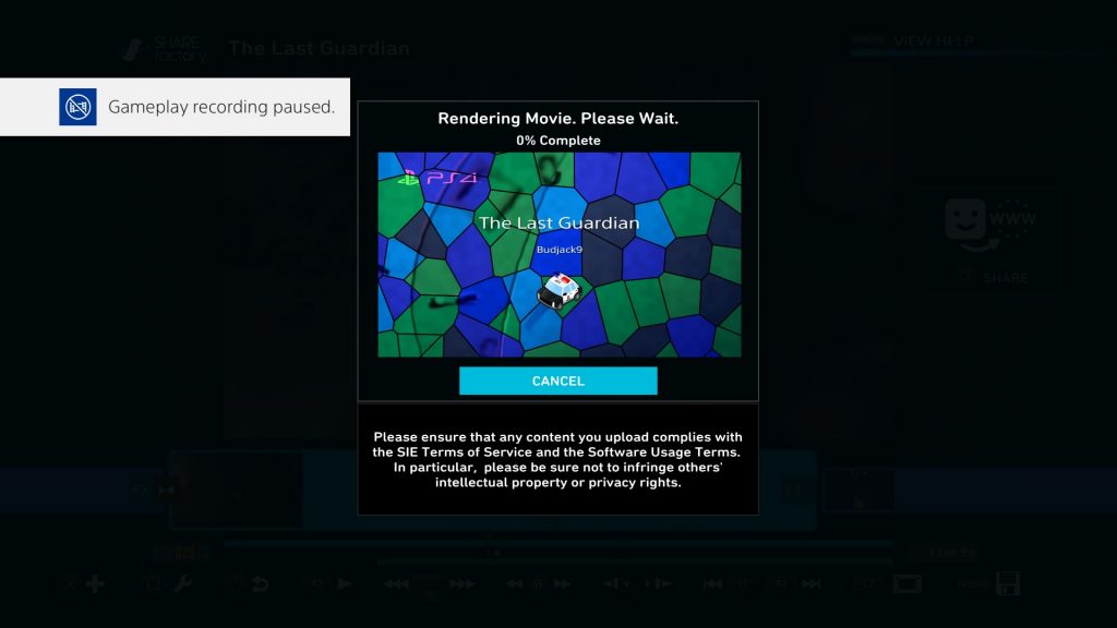 Once all the pieces are in place, all that’s left to do is render the video. So, double-check everything again and hit the triangle button on your DualShock 4 Controller when you’re ready. Before you get to decide what to do with it, you’ll be forced to wait until it fully renders. Depending on the length and quality of your final edit, you might or might not wait over 10 minutes.