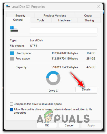 Accessing the Properties screen of the Windows partition - From the insides of the Properties screen, click on the General tab at the top, then click on Details.