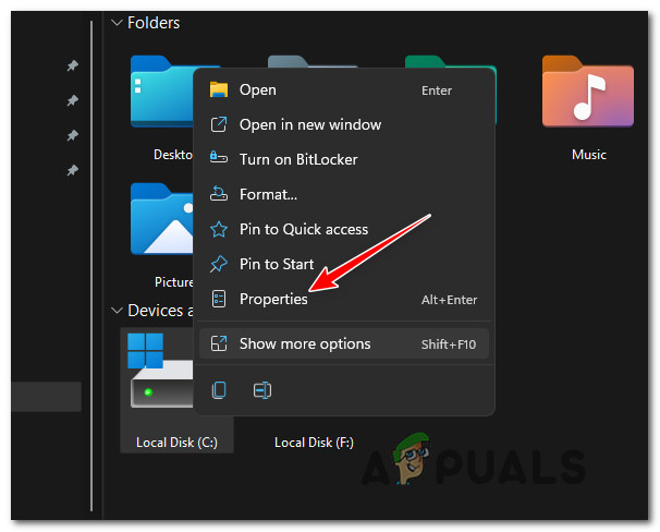 - Next, right-click on your Windows Partition (from File Explorer), then click on Properties from the context menu that just appeared.
