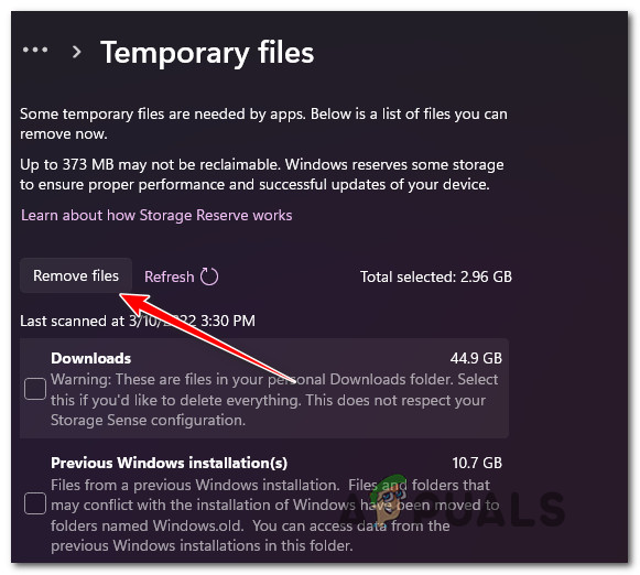 if this scenario is applicable, you should be able to fix the problem by accessing the Storage usage menu of your Windows installation and clearing the Temporary Files.