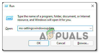 - Next, inside the text box, type ‘ms-settings:windowsupdate’ and press Enter to open up the Windows Update page of the Settings menu.