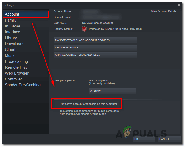 Accessing Steam’s Settings Menu - Inside the Settings menu, select Account from the left-hand side menu, then check the box associated with Don’t save account credentials on this computer. Next, click Ok to save the changes.