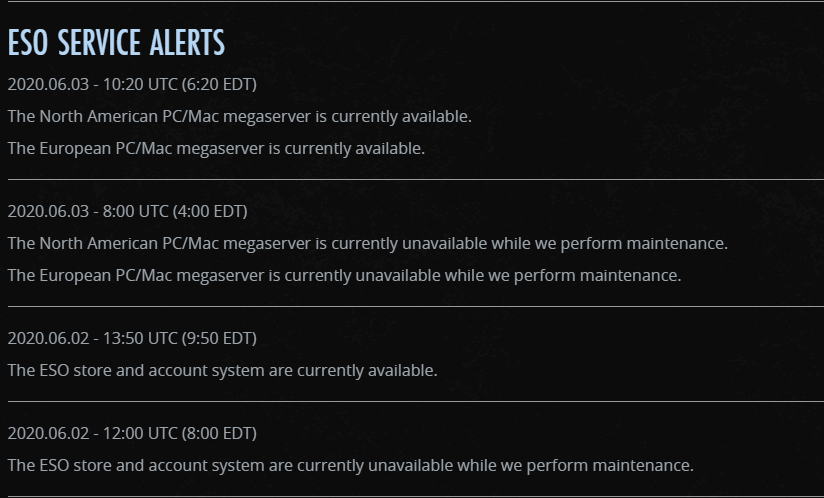 The ESO community got accustomed to fairly often scheduled maintenance periods, so you should start by checking for any ESO Service alerts. It’s possible that ZeniMax developers are eider busy with scheduled maintenance or they are dealing with an unexpected server outage period.