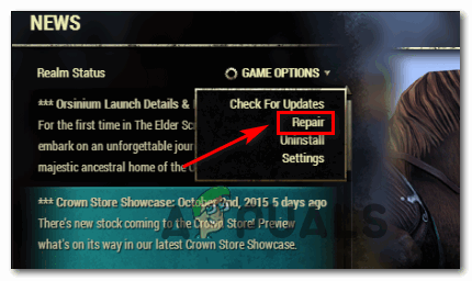- Once you’re renamed the ProgramData folder, open ESO’s launcher and wait until you see the initial screen. Once you see it, click on Game Options to bring up the drop-down menu, then click on Repair to initiate the operation.