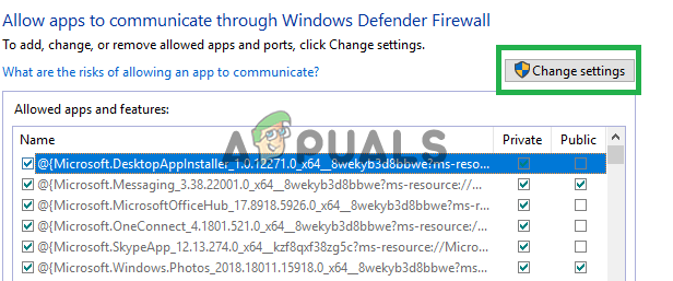 Clicking on the “Allow an App or feature” through firewall option - Click on the “Change Settings” option.