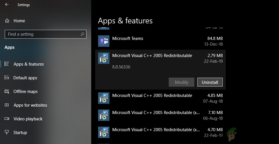 Apps section in Settings - Scroll down and click on “Microsoft Visual C++“.