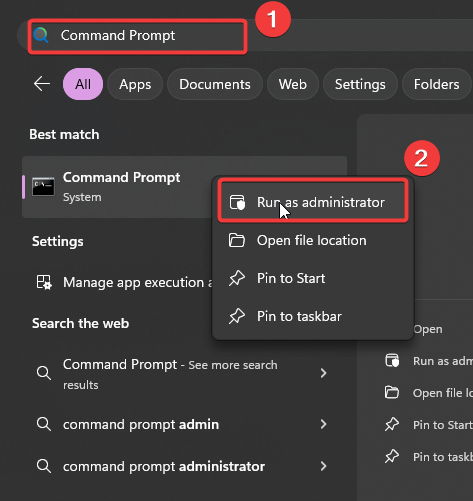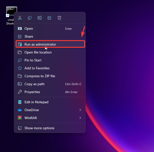 - Once done, go to the desktop, right-click the CMD shortcut, and select Run as administrator.