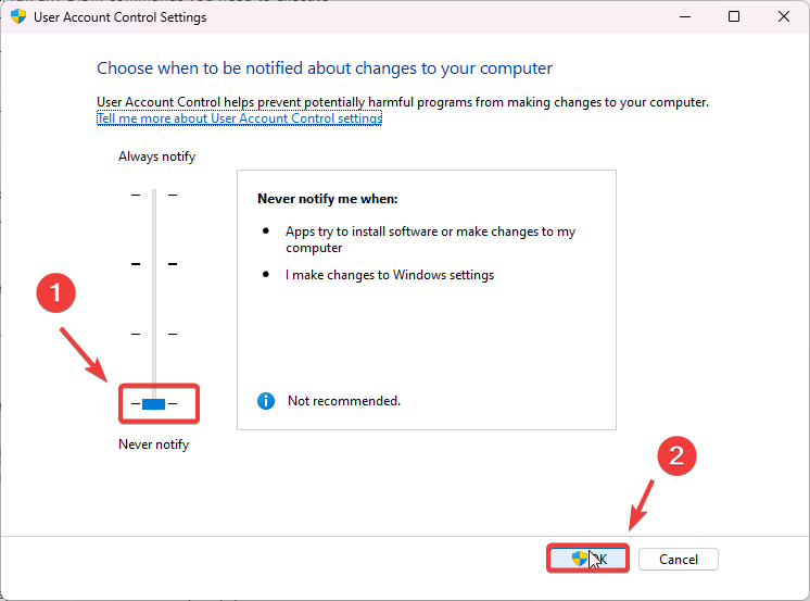 - To completely disable the UAC, drag the slider to Never Notify and click OK to save the changes.