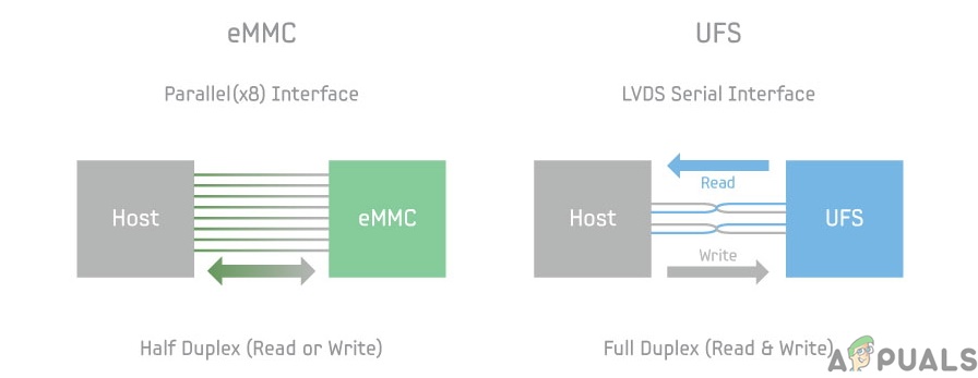 eMMC and UFS are both used in our smartphones as storage. Both have managed to increase their speed with their latest versions. However, eMMC still lacks in speed from UFS. Latest UFS in our smartphones is similar to an SSD regarding speed and space. However, some budget phones will still use eMMC to provide the latest technology with low budget storage. UFS uses the full-duplex that provides read and write operations simultaneously. eMMC is half-duplex, which only performs a single operation at a time, whether to write or read.