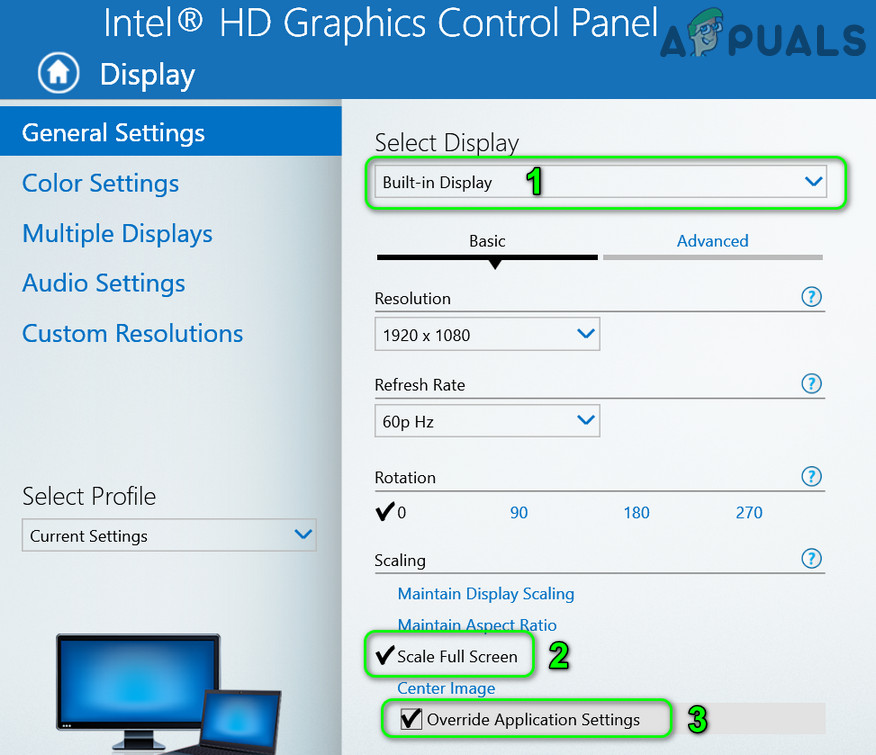 Open Graphics Properties - Now click on Scale Full Screen (make sure the affected display is selected in the Select Display dropdown) and then enable the option of Override Application Settings. The Nvidia users may enable Override the Scaling Mode Set by Games and Programs. If you are using an AMD GPU, then enable (if it is disabled) GPU Scaling for 1 or all displays (AMD software>> Settings >> Display).