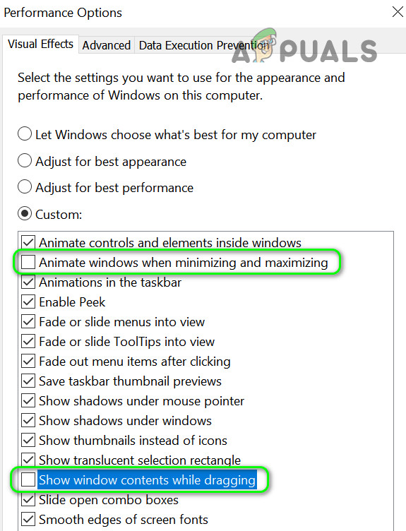 Disable Windows Animation and Showing of Content in the Advanced System Settings - Now click on Apply/OK buttons and reboot your PC to check if the display issue is resolved.