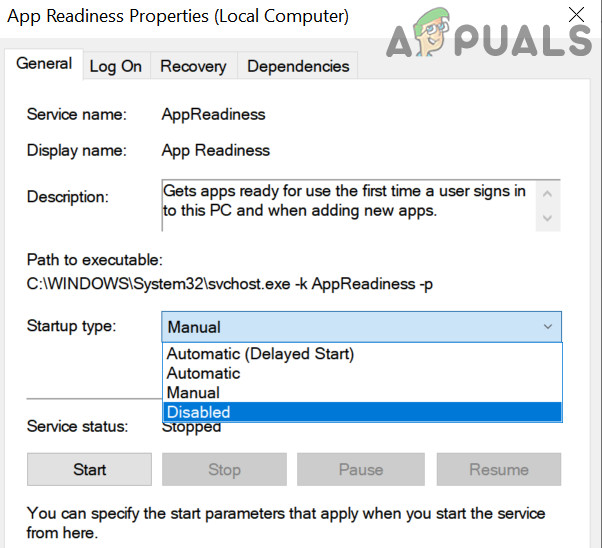 Open Services as Administrator - Now double-click on the App Readiness service and expand the dropdown of Startup type.