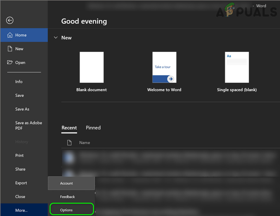 - Launch an office application (e.g., MS Word) and open its Options (you may have to navigate to the File tab and expand More).
