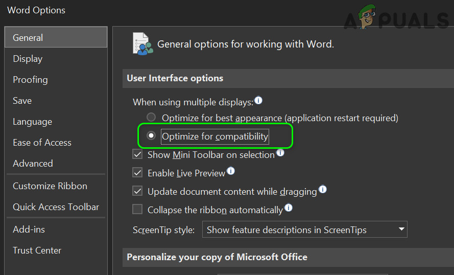 - Then, in the section of User Interface Options, select Optimize for Compatibility (for the “When Using Multiple Displays” option).
