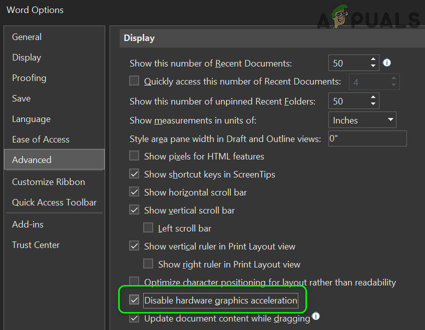 Optimize MS Word for Compatibility - Now navigate to the Advanced tab and then in the Display section, check the option of Disable Hardware Graphics Acceleration.