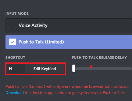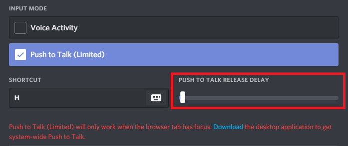 - Go to Settings > Voice (Voice & Video). Adjust the Push to Talk Release Delay slider to control how quickly Discord stops your voice after releasing the key. The minimum is 20 ms, but set it a bit higher to avoid accidental interruptions.
