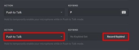 - Choose Push to Talk as the action. Click Record Keybind, press the key you want for Push to Talk, then select Stop Recording to save it.