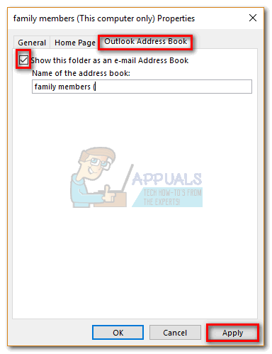 - Once you’re inside New Contacts Properties, click the Outlook Address Book tab and make sure that the box next to Show this folder as an email Address Book is enabled.