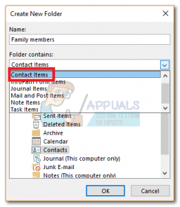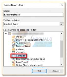 - Now, click on Contacts to specify where you want the folder placed and click OK.