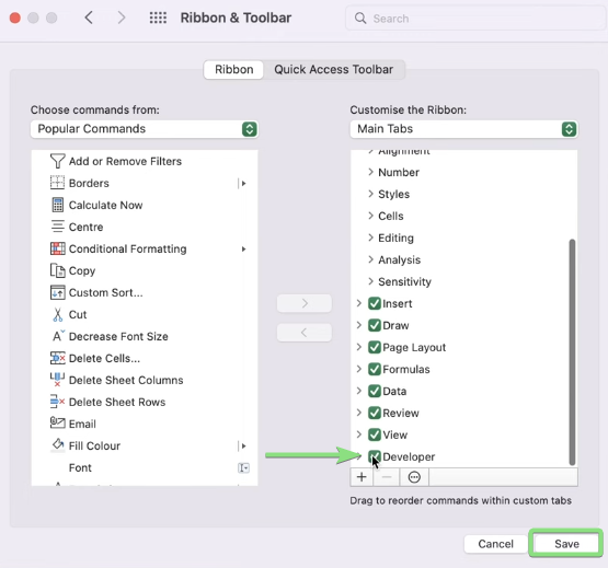 To add the Developer tab to your ribbon, follow the steps for your operating system: