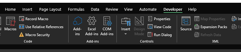 With the tab unlocked, you can record simple macros, write VBA procedures, insert ActiveX or Form controls, and import or export XML data—transforming basic spreadsheets into dynamic applications.