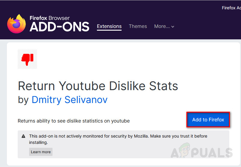 Search for “Return Youtube Dislike stats” on the official Firefox Add-ons Store. - Select “Return Youtube Dislike Stats” by Dmitry Selivanov and click Add to Firefox.
