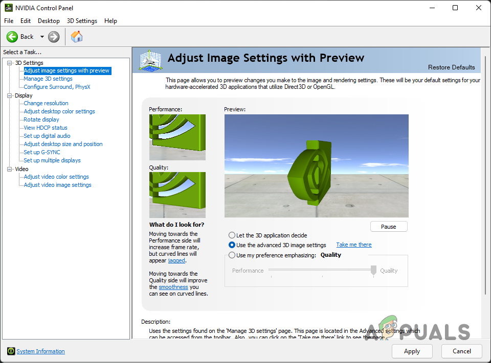 - There, make sure that the Use the advanced 3D image settings option is selected and then click the Apply button.