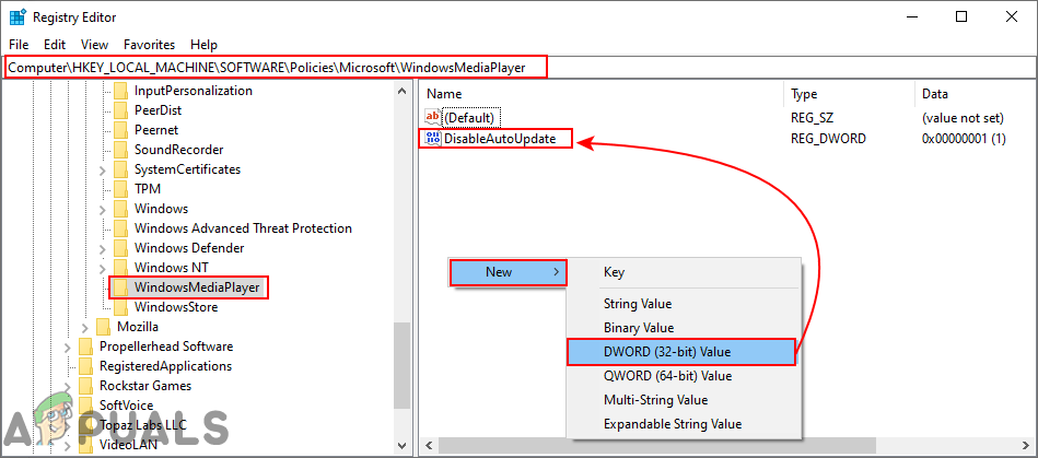 - In the WindowsMediaPlayer key right-click on the right pane and choose the New > DWORD (32-bit) Value option. Name this value as “DisableAutoUpdate“.