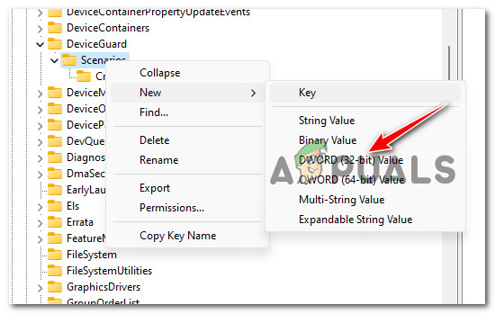 - Once the HypervisorEnforcedCodeIntegrity key is created, the next step is to create the DWORD that will actually enable this functionality. To do this, right-click on the newly created HypervisorEnforcedCodeIntegrity key and choose New > DWORD (32-bit) Value.