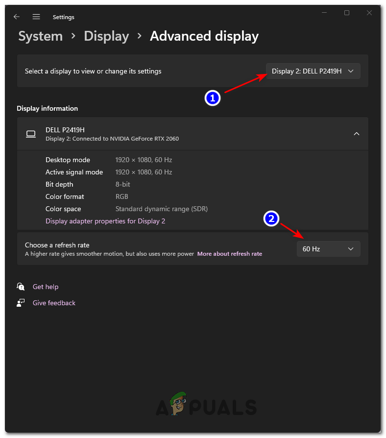 Accessing the Advanced Display menu - From the Advanced display settings, select the correct display from the box at the top, then change the drop-down menu associated with Choose a refresh rate to Dynamic and select your favorite mode.