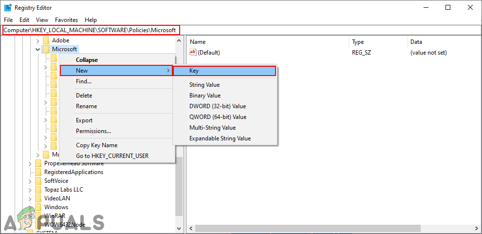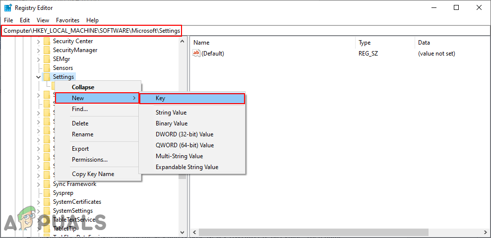 - Create the missing “FindMyDevice” key by right-clicking on the Windows key and choosing the New > Key option.
