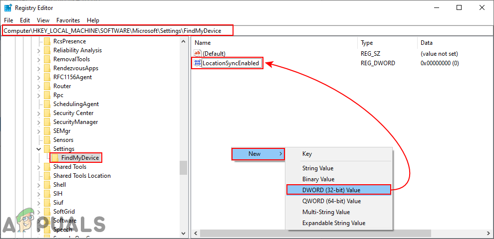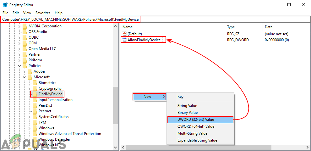 Creating missing key - In the FindMyDevice key, right-click on the right pane and choose New > DWORD (32-bit) Value. Name the new value as “AllowFindMyDevice“.