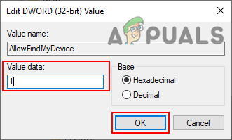 Creating a new value - Double-click on the newly created value and set the value data to 1. This will enable the Find my device feature.