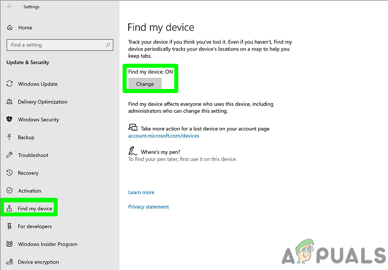 Opening Updates & Security settings - On the left pane, click on Find my device and then click on the Change button.