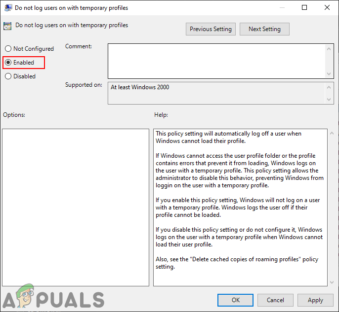Navigating to the setting - Double-click on the setting named “Do not log users on with temporary profiles” and it will open in another window. Now you can change the toggle option from Not Configured to Enabled.