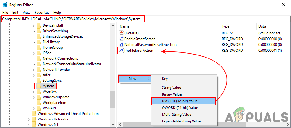 - In the right pane of the System key, right-click and choose the New > DWORD (32-bit) Value option. Rename this value as “ProfileErrorAction“.