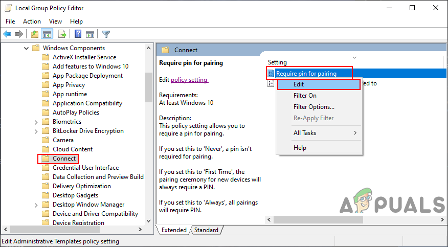 Navigating to the setting - Right-click on the setting named “Require pin for pairing” and choose the Edit option. This will open the setting in another window.