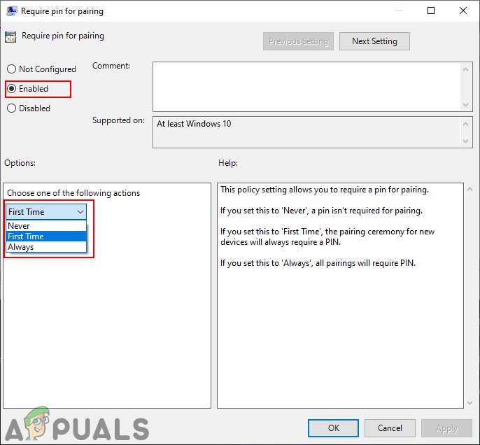 Configuring the PIN settings - The remaining two options are for enabling the PIN for pairing. If you select the First Time option, then it will only ask for a PIN for the first time and then it won’t. If you choose the Always option, then it will always ask for a PIN when pairing.