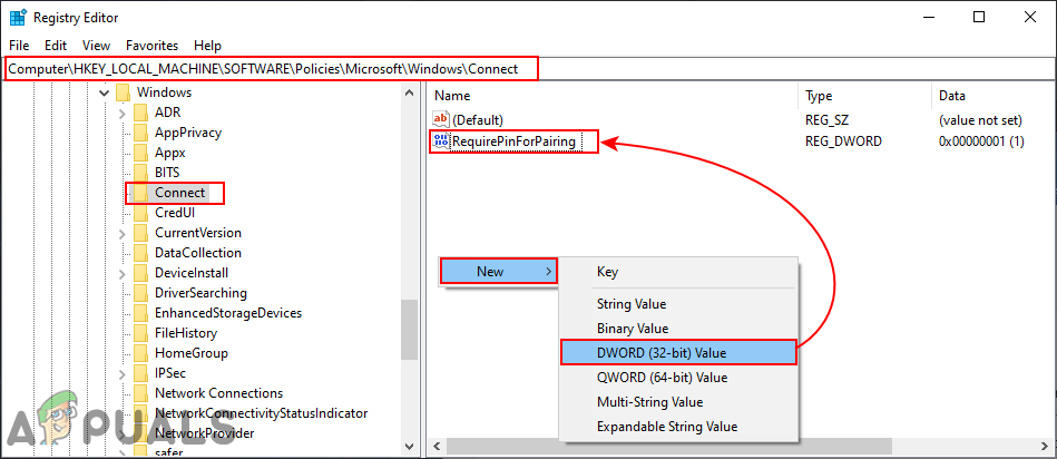 - Right-click on the right pane of the Connect key and choose the New > DWORD (32-bit) Value option to create a value. Now rename the value as “RequirePinForPairing“.
