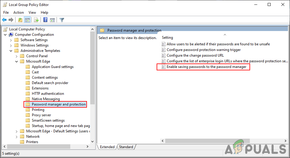 For the older version of Edge, the path will be “User Configuration\Administrative Templates\Windows Components\Microsoft Edge\“. The name of the policy-setting will be “Configure Password Manager“.