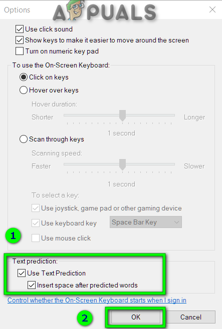 - To disable text prediction, leave the checkbox named ‘Use Text Prediction’ unchecked. After that, click on the ‘OK’ button to proceed.