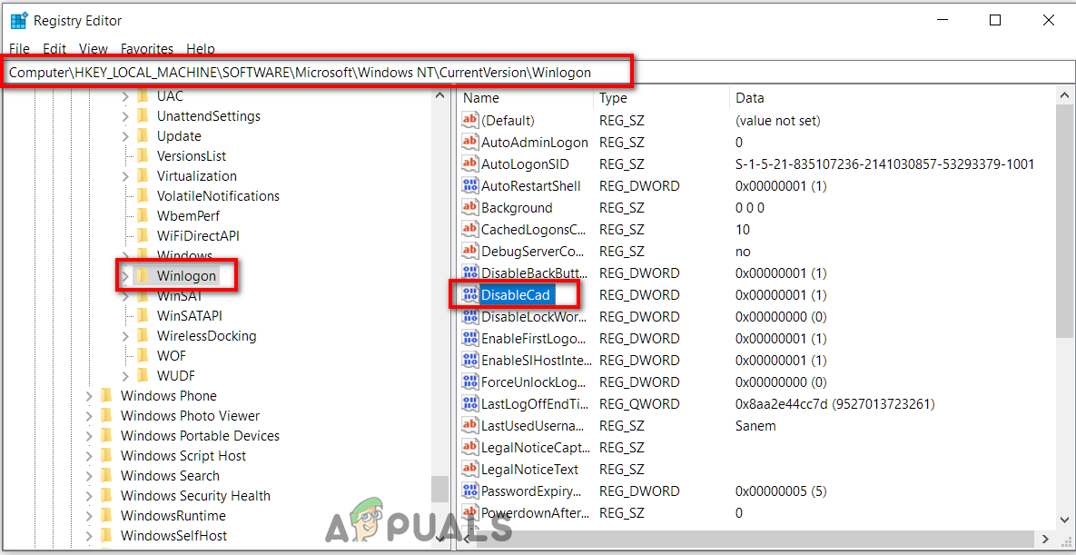 - After double-click on the option named as Winlogon, scroll to the right side and double-click the entry ‘DisableCAD’ as shown in the image below.