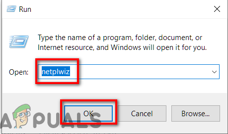 - A dialogue box will appear. Type ‘netplwiz’ in the textbox named ‘Open’ and click on the ‘OK’ button to continue as shown in the below image.