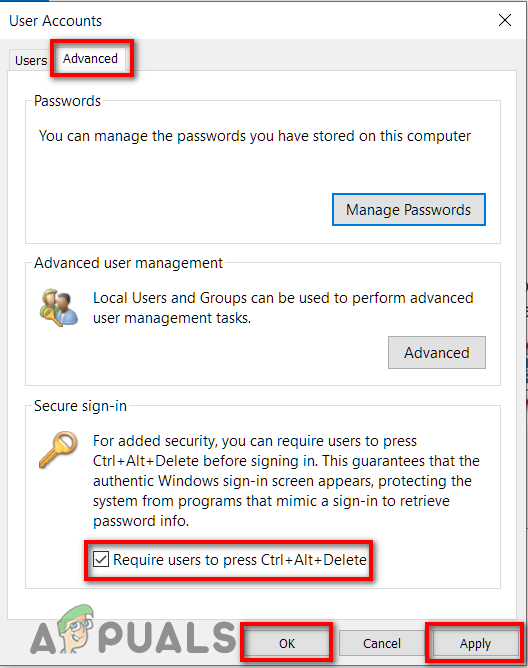 - Click on the ‘Advanced’ tab and checkmark the option of ‘Require users to press Ctrl + Alt + Delete’ right under the Secure sign-in.