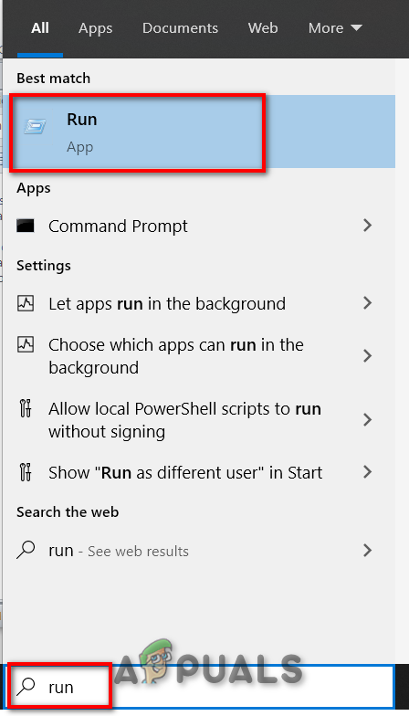 - In the search bar type ‘Run’ and click on the ‘Run’ app as shown in the below image.